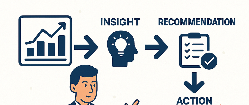 Visual pathways from data → insight → recommendation → action